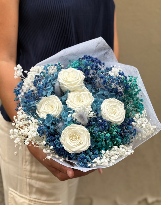 Bouquet di Fiori Stabilizzati Blu e Bianchi