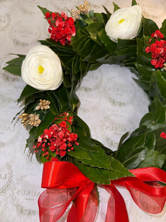 Corona d'Alloro - Ranuncoli stabilizzati, mini Bacche oro e Gypsophila rossa