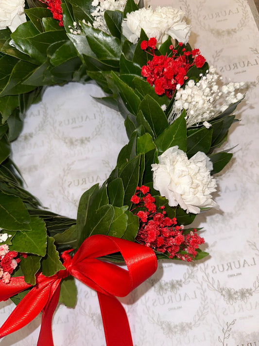 Corona d'Alloro - Garofani bianchi, Gypsophila bianca e rossa