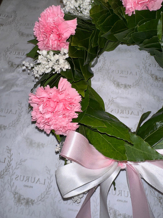 Corona d'Alloro - Garofani rosa e Gypsophila bianca