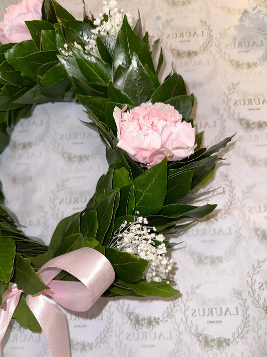 Corona d'Alloro - Peonie rosa e Gypsophila bianca