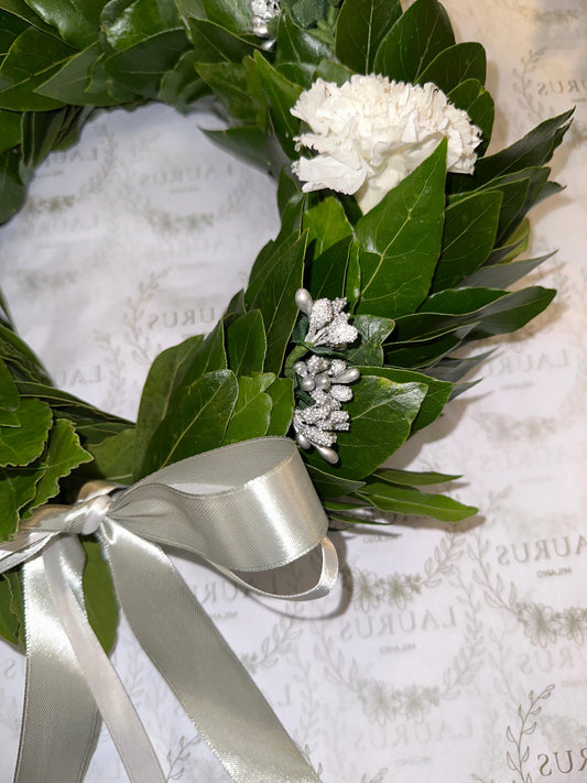 Corona d'Alloro - Garofani bianchi e mini Bacche argento