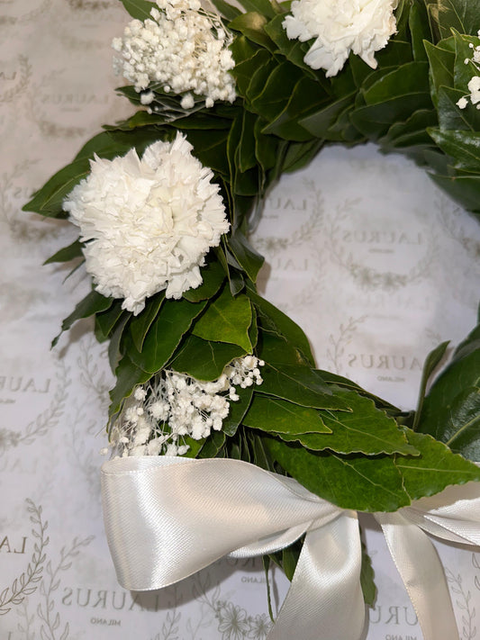 Corona d'Alloro - Garofani bianchi e Gypsophila