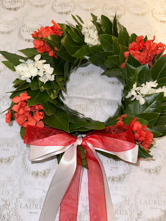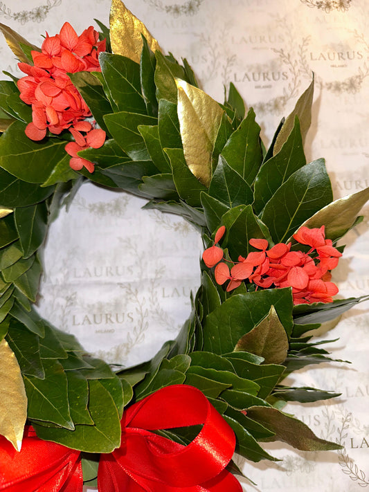 Corona d'Alloro - Foglie dorate e Ortensia rossa