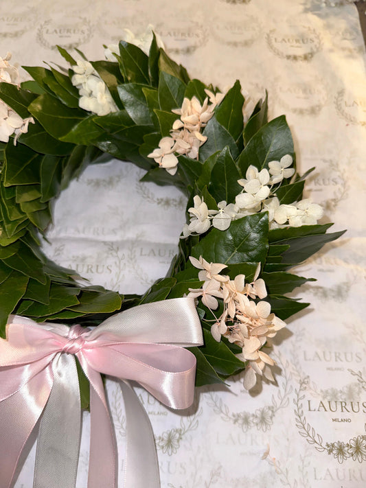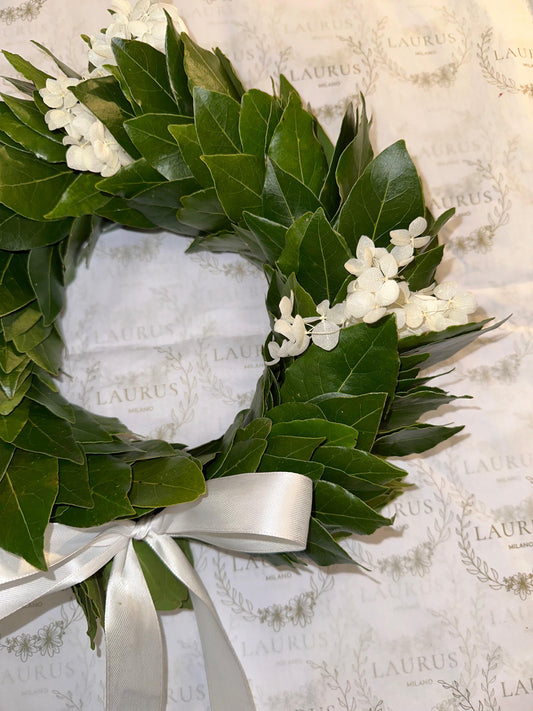 Corona d'Alloro - Ranuncoli bianchi e Gypsophila