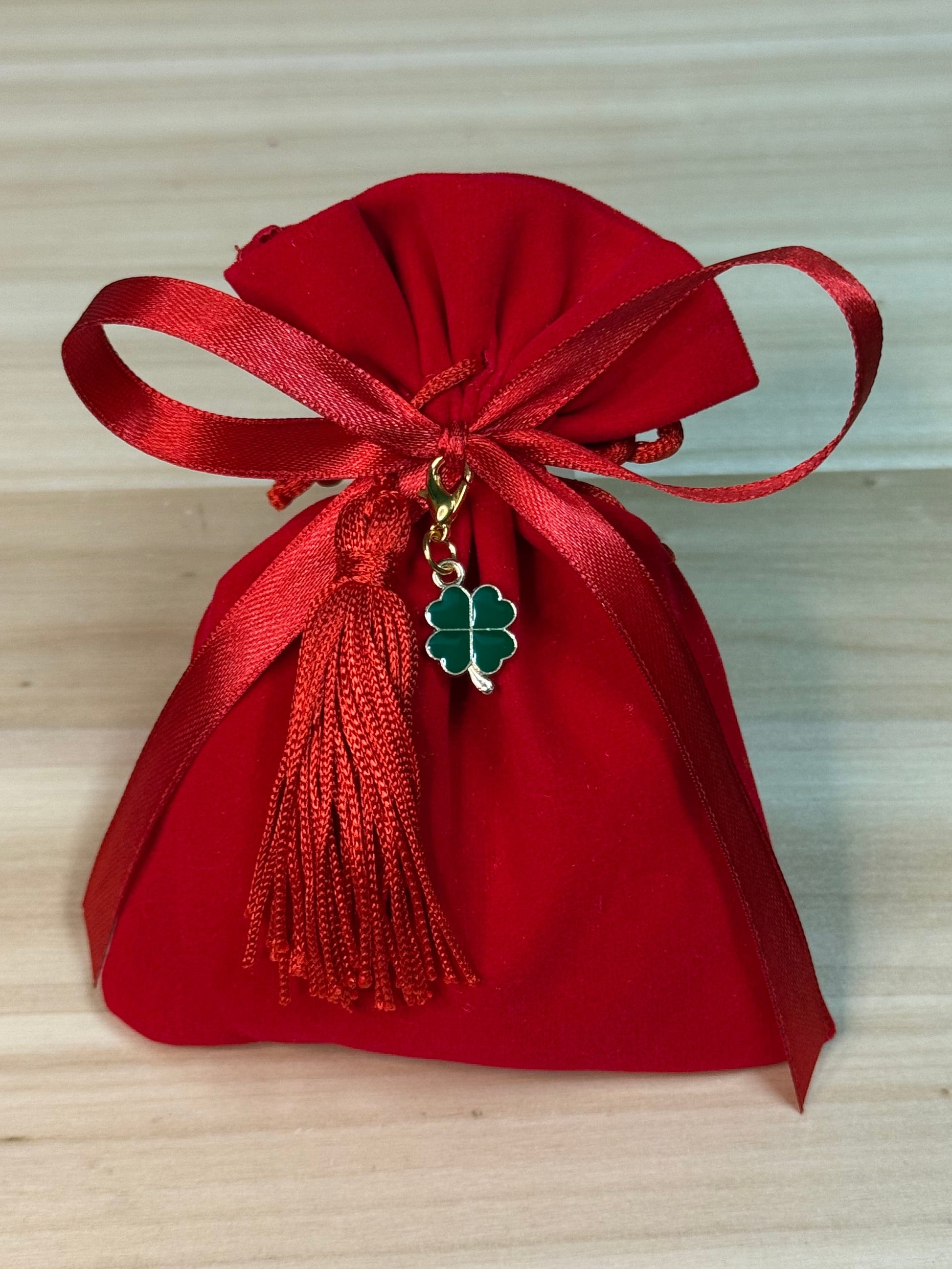 Bomboniera Laurea - sacchetto velluto rosso con portachiavi quadrifoglio
