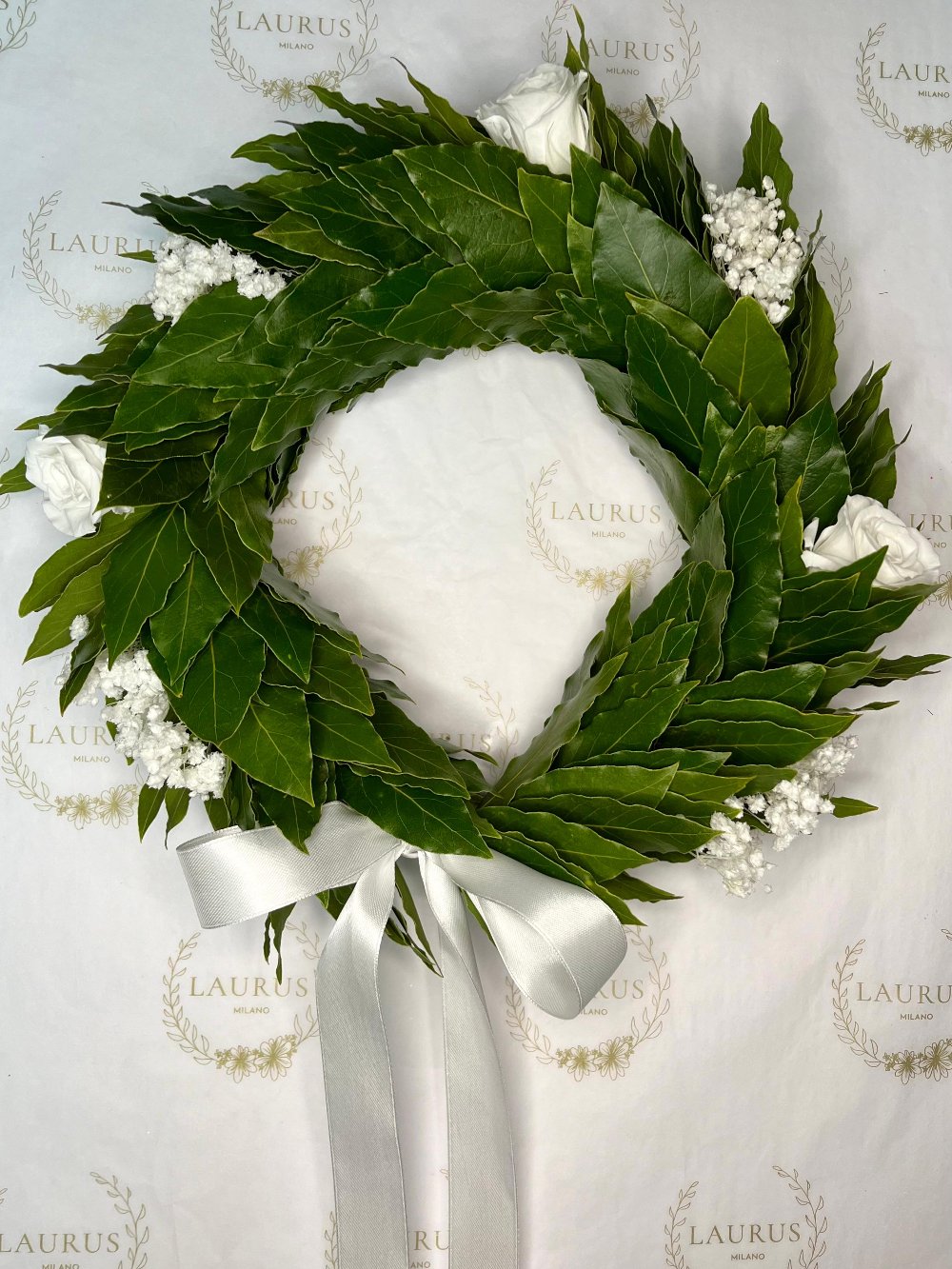 Corona d'Alloro con 3 rose stabilizzate piccole bianche, Gypsophila stabilizzata bianca e fiocco semplice in raso bianco (01) da 30cm.