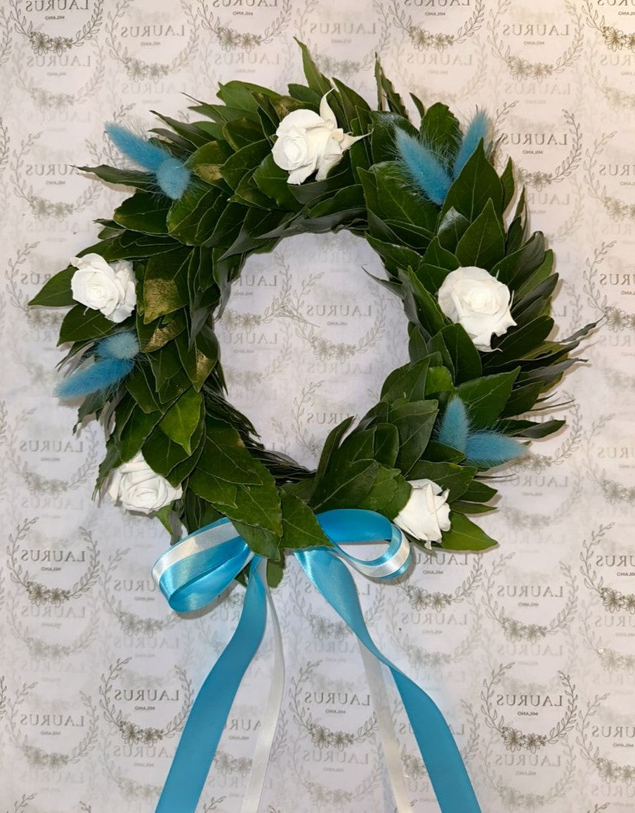 Corona d'Alloro con 5 rose stabilizzate piccole bianche, Pampas azzurri e fiocco doppio in raso bianco e azzurro da 30cm.