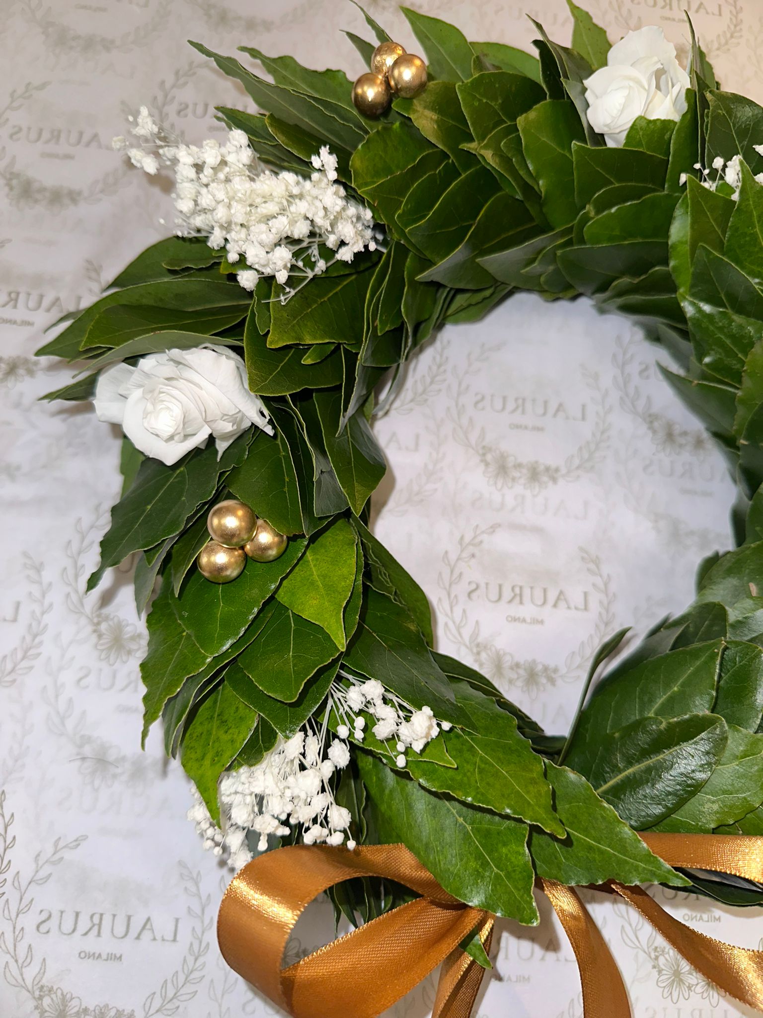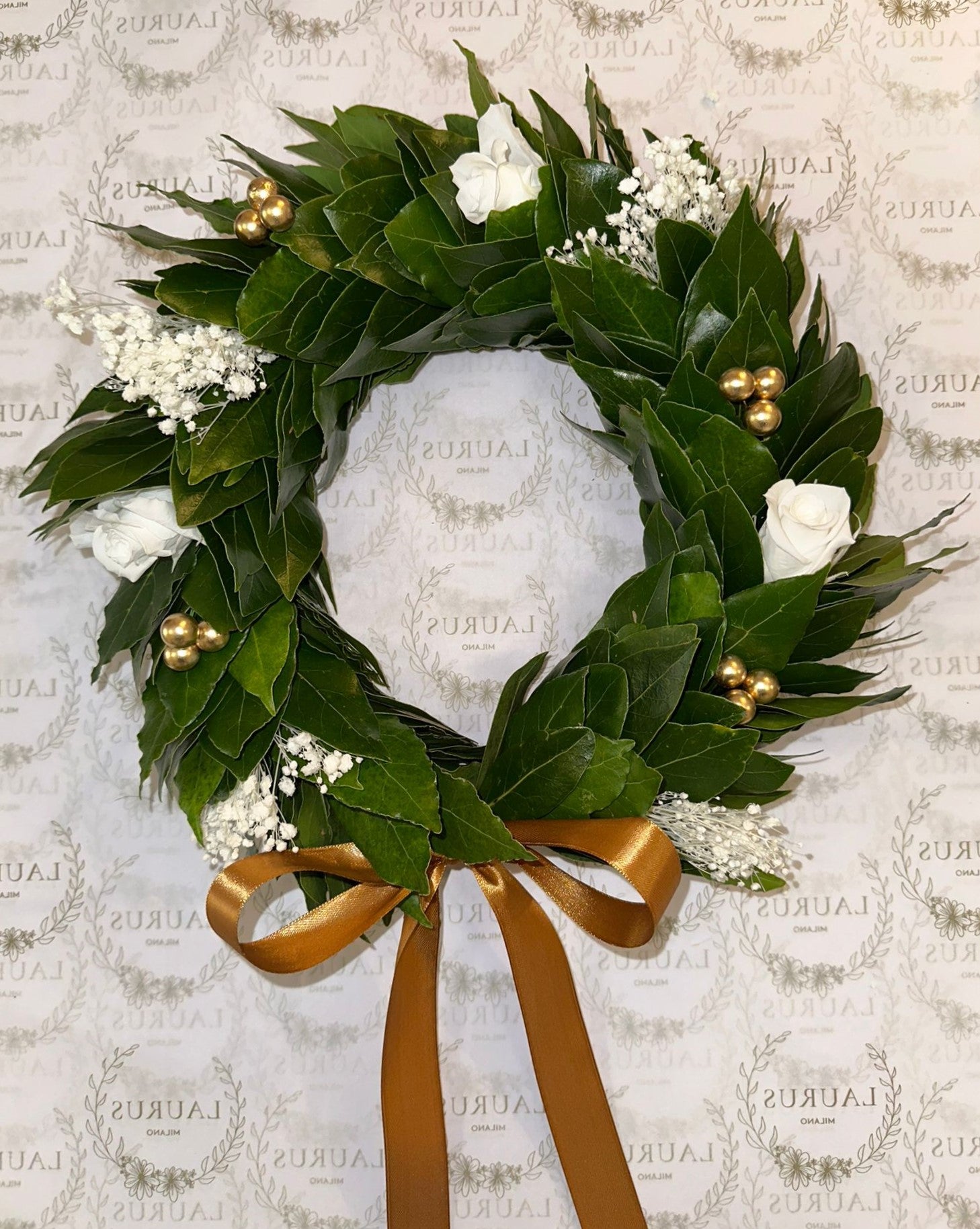 Corona d'Alloro - Gypsophila, Bacche oro e Rose bianche