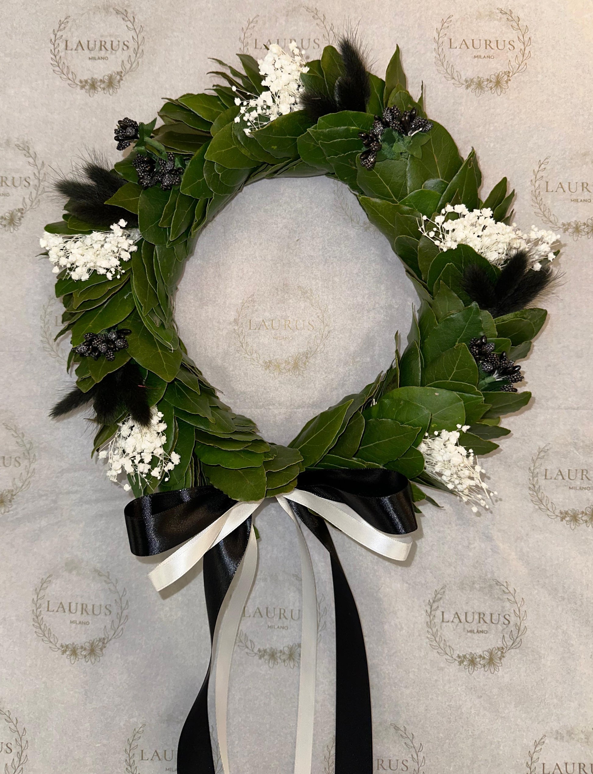 Corona d'Alloro con Gypsophila stabilizzata bianca, Pampas neri, mini Bacche nere e fiocco doppio in raso nero e bianco sottile (30-s01) da 30cm.
