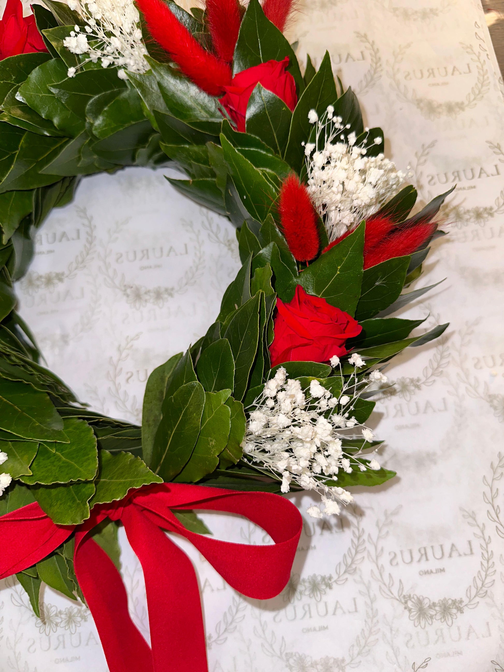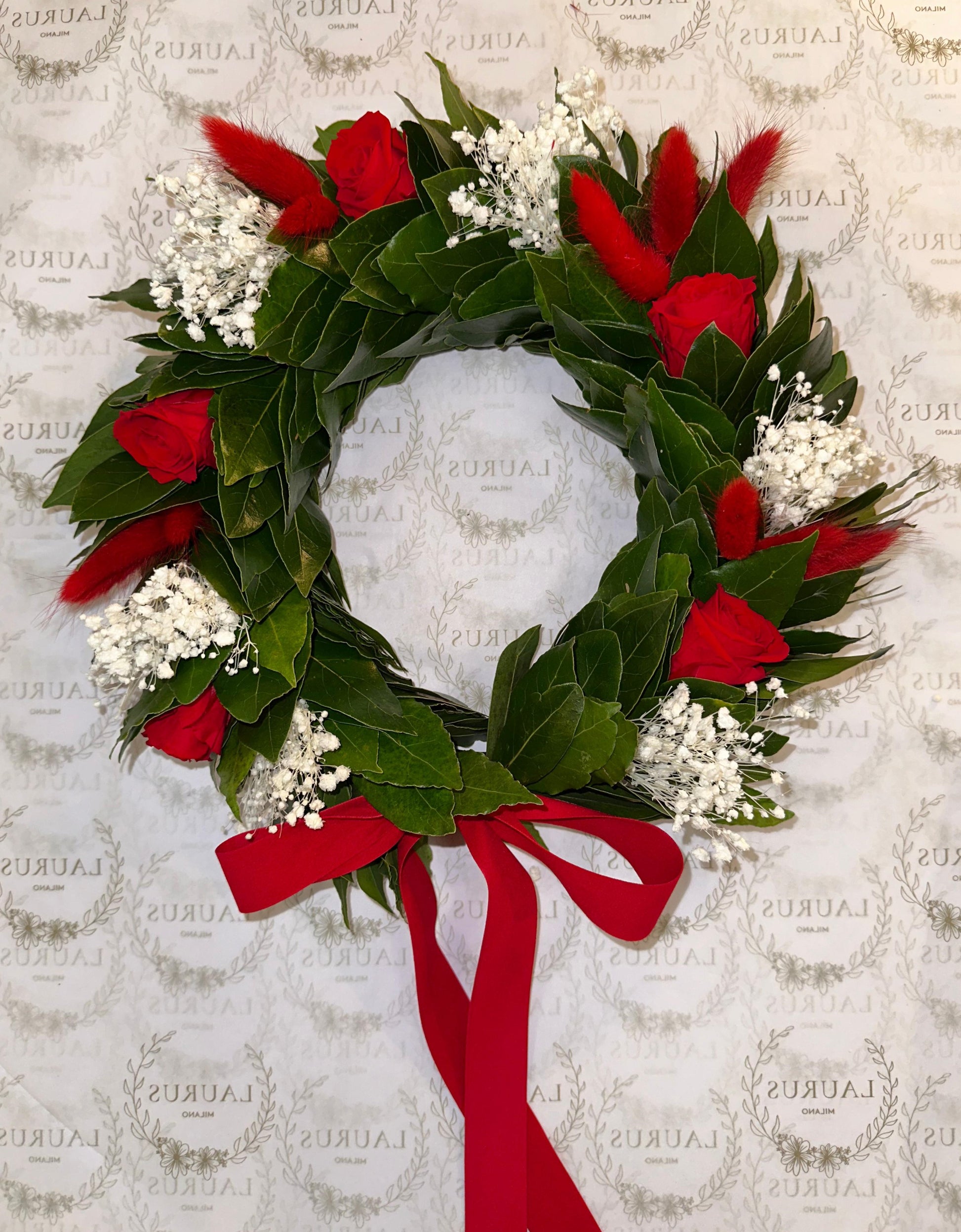 Corona d'Alloro con 5 rose stabilizzate piccole rosse, Gypsophila stabilizzata bianca, Pampas rossi e fiocco semplice in velluto rosso (vell16) da 30cm.
