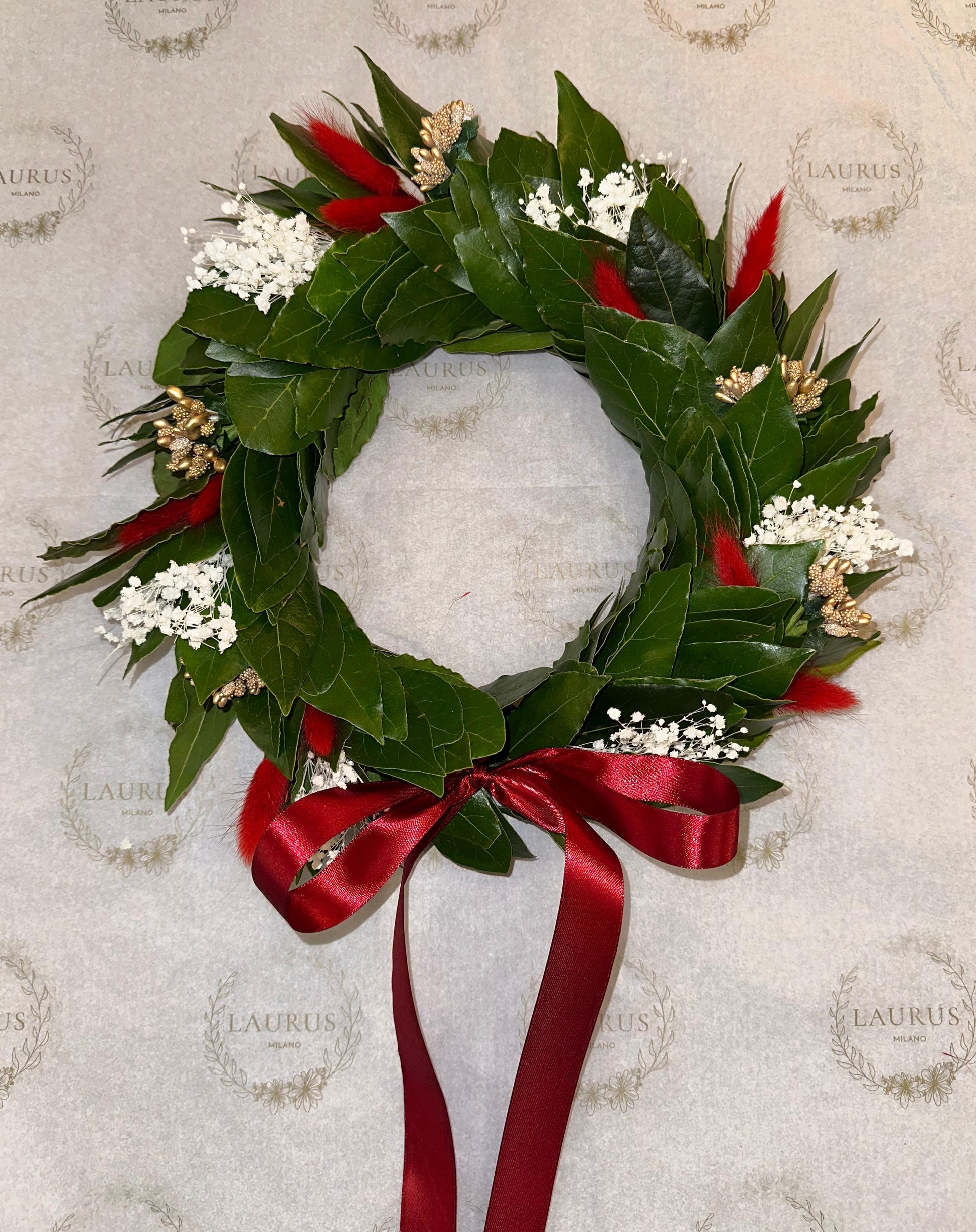 Corona d'Alloro - Gypsophila, Pampas rossi e mini Bacche