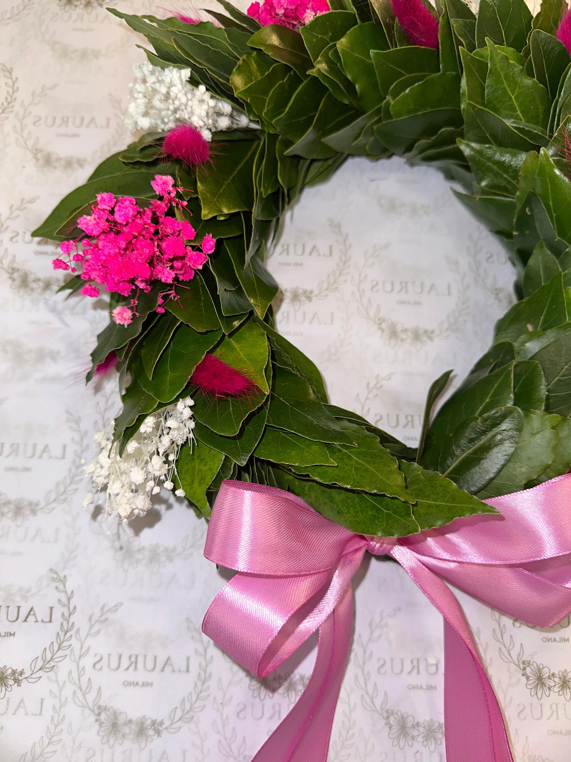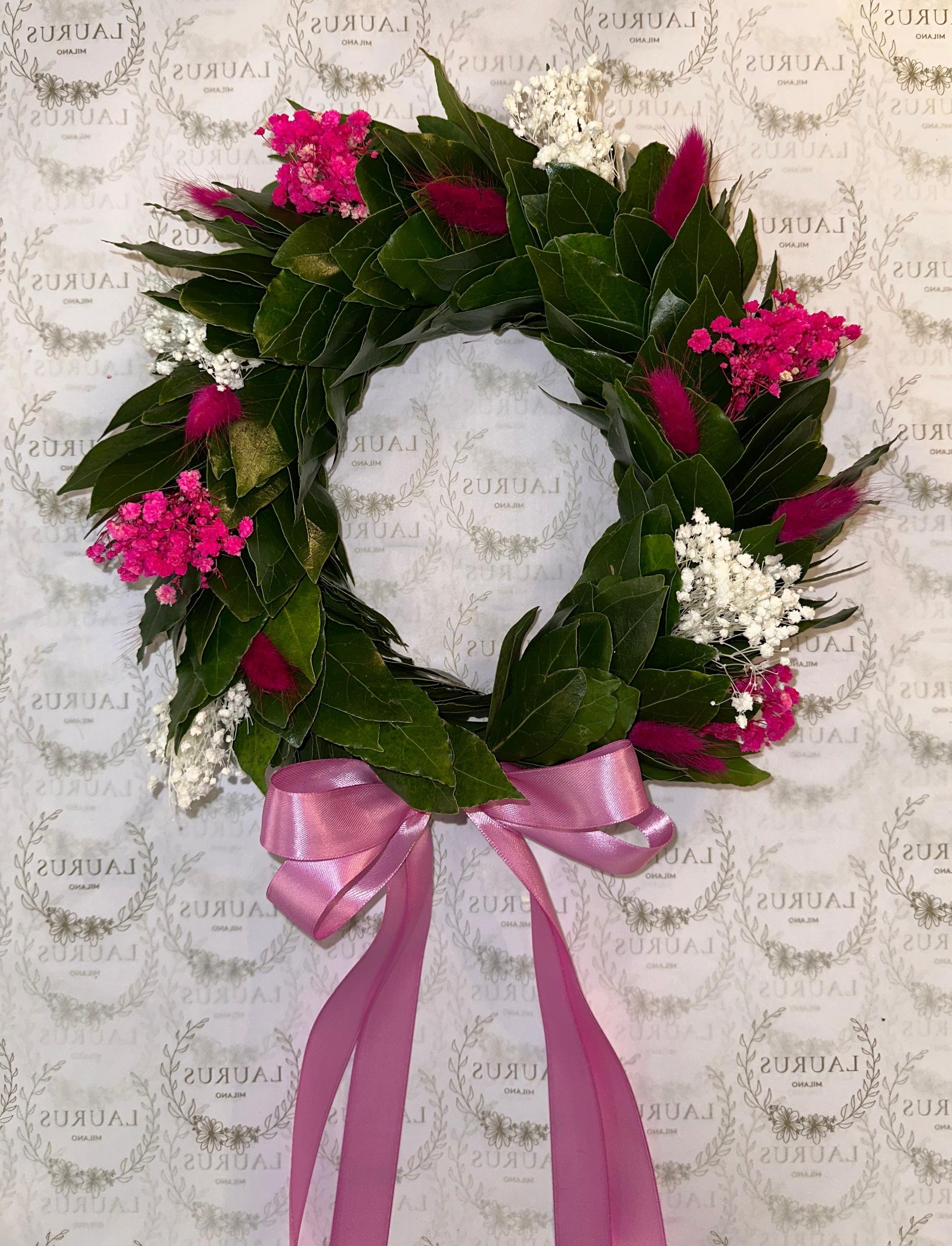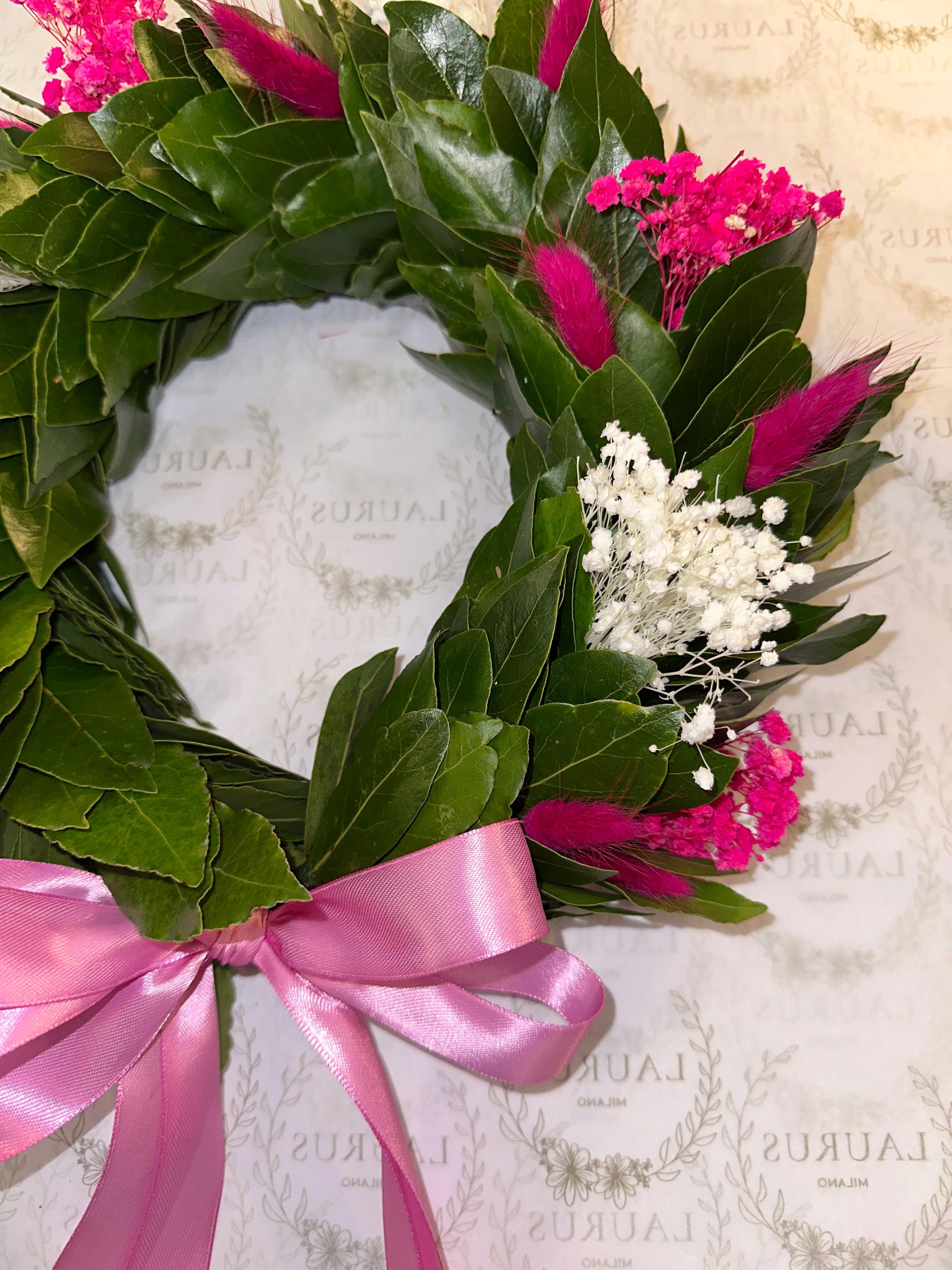 Corona d'Alloro con Gypsophila stabilizzata bianca e rosa, Pampas fucsia e fiocco doppio in raso rosa chiaro (23) da 30cm.